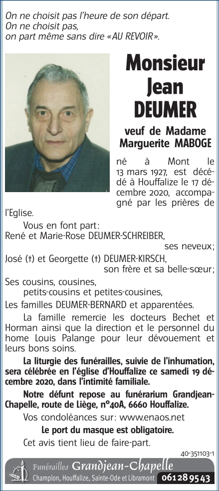 Décédé à Houffalize (6660) le jeudi 17 décembre 2020 à l'âge de 93 ans