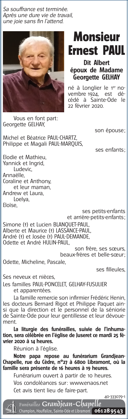 Décédé à Sainte-Ode (6680) le samedi 22 février 2020 à l'âge de 95 ans