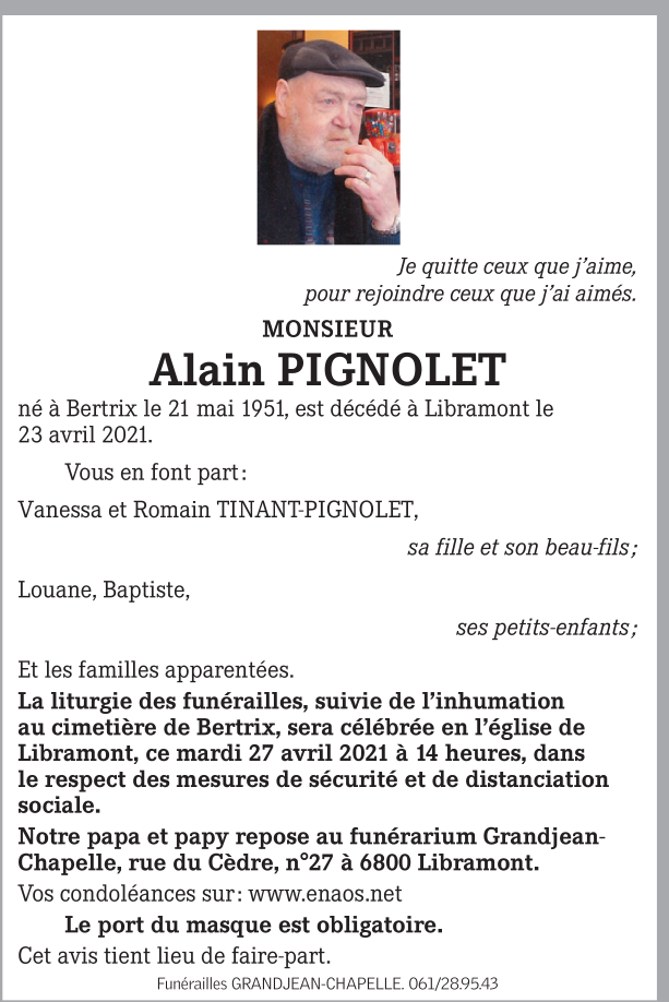 Décédé à Libramont-Chevigny (6800) le vendredi 23 avril 2021 à l'âge de 69 ans