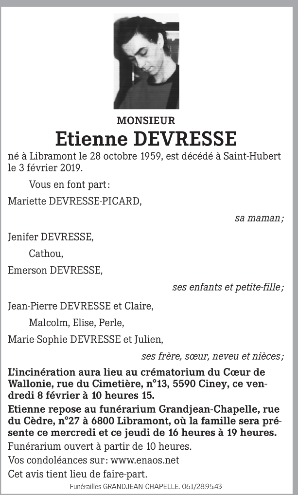 Décédé à Saint-Hubert (6870) le dimanche 3 février 2019 à l'âge de 59 ans