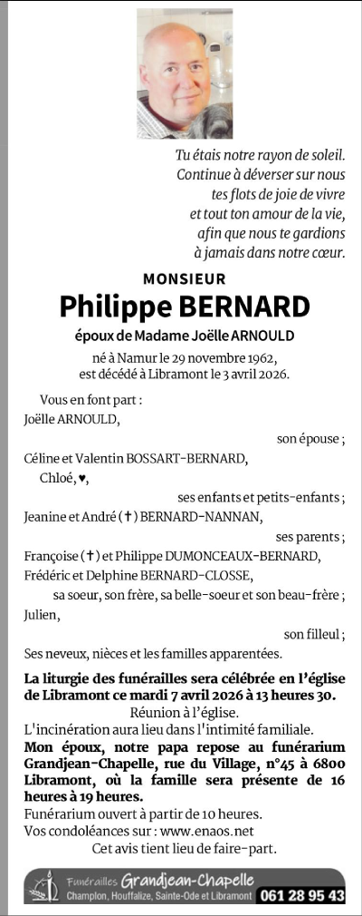 Décédé à Libramont (6800) le vendredi 3 avril 2026 à l'âge de 63 ans