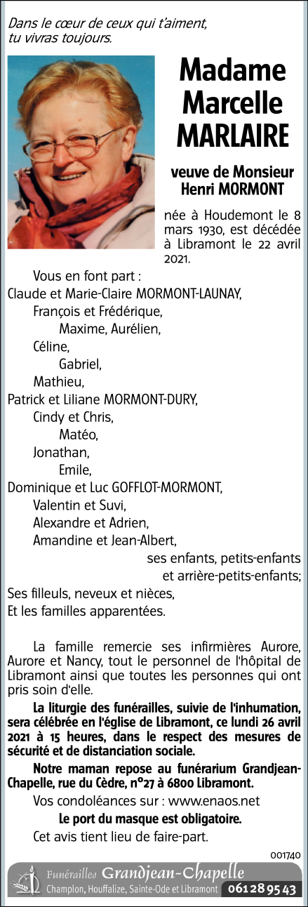 Décédée à Libramont (6800) le jeudi 22 avril 2021 à l'âge de 91 ans