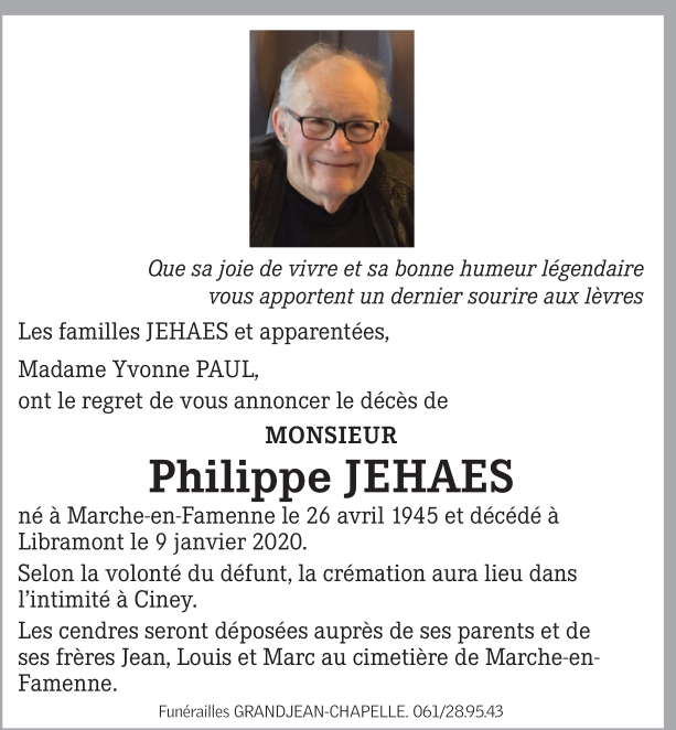 Décédé à Libramont (6800) le mardi 14 janvier 2020 à l'âge de 74 ans