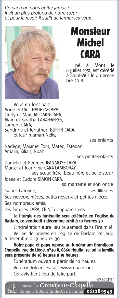 Décédé à Saint-Vith (4780) le mardi 4 décembre 2018 à l'âge de 67 ans