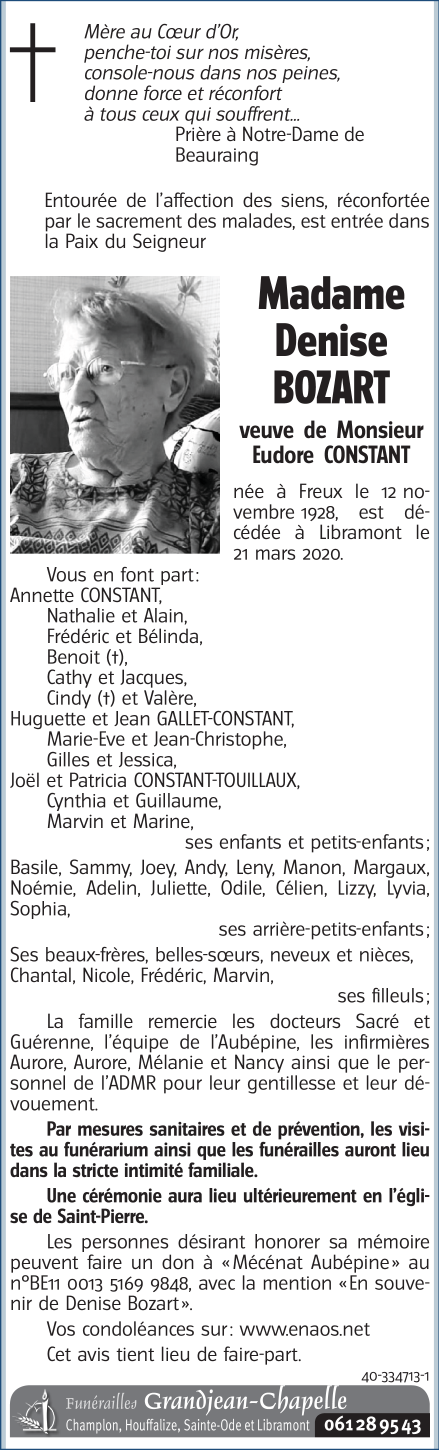 Décédée à Libramont (6800) le samedi 21 mars 2020 à l'âge de 91 ans