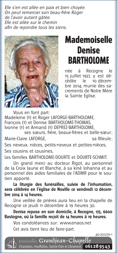 Décédée à Recogne (6600) le mercredi 10 décembre 2014 à l'âge de 87 ans