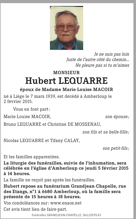 Décédé à Amberloup (6680) le lundi 2 février 2015 à l'âge de 75 ans