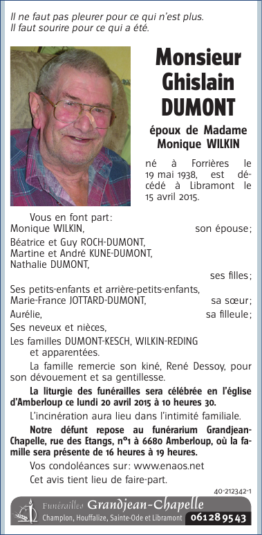 Décédé à Libramont (6800) le mercredi 15 avril 2015 à l'âge de 76 ans