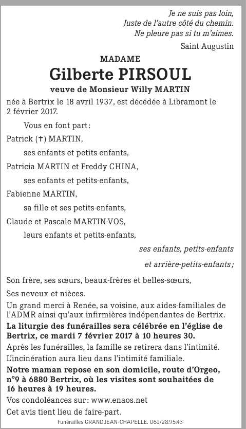 Décédée à Libramont (6800) le jeudi 2 février 2017 à l'âge de 79 ans