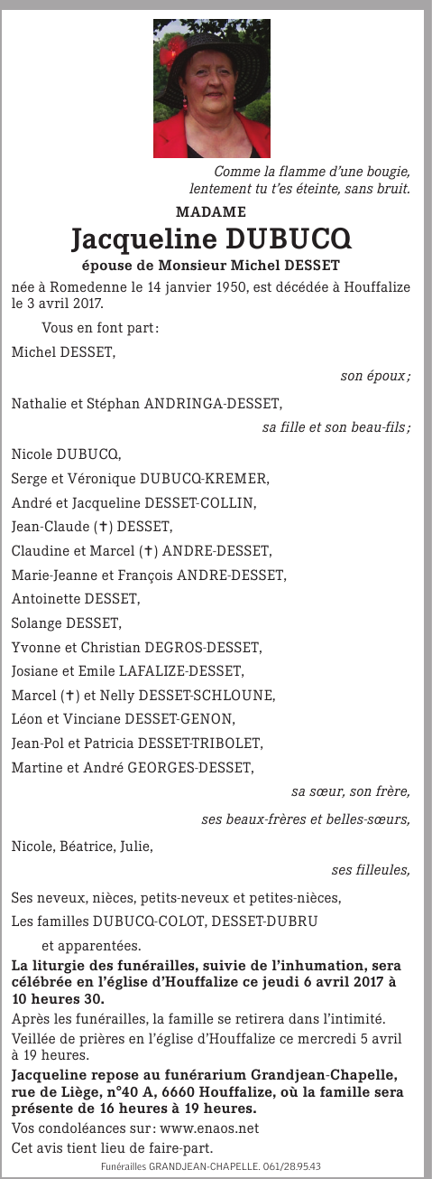 Décédée à Houffalize (6660) le lundi 3 avril 2017 à l'âge de 67 ans