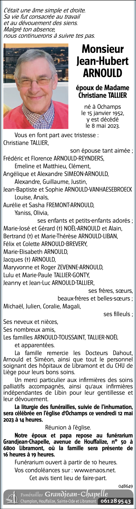 Décédé à Ochamps (6890) le lundi 8 mai 2023 à l'âge de 71 ans