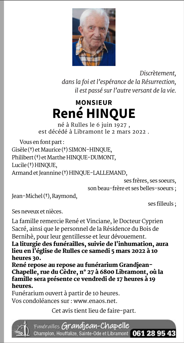 Décédé à Libramont (6800) le mercredi 2 mars 2022 à l'âge de 94 ans