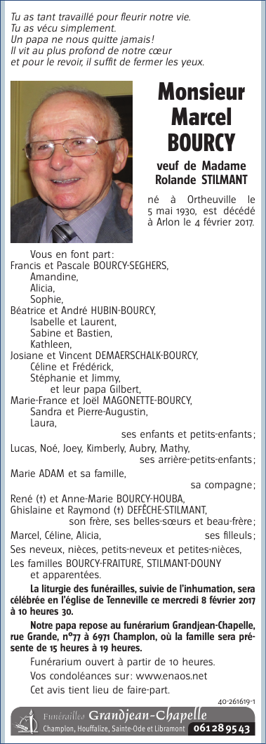 Décédé à Arlon (6700) le samedi 4 février 2017 à l'âge de 86 ans