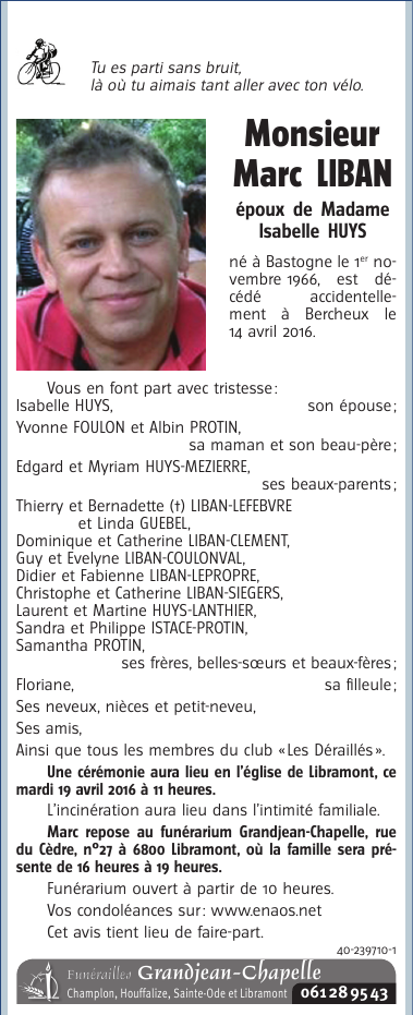 Décédé à Bercheux (6640) le jeudi 14 avril 2016 à l'âge de 49 ans