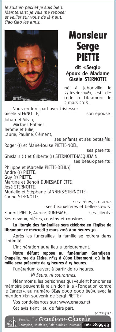 Décédé à Libramont (6800) le vendredi 2 mars 2018 à l'âge de 57 ans