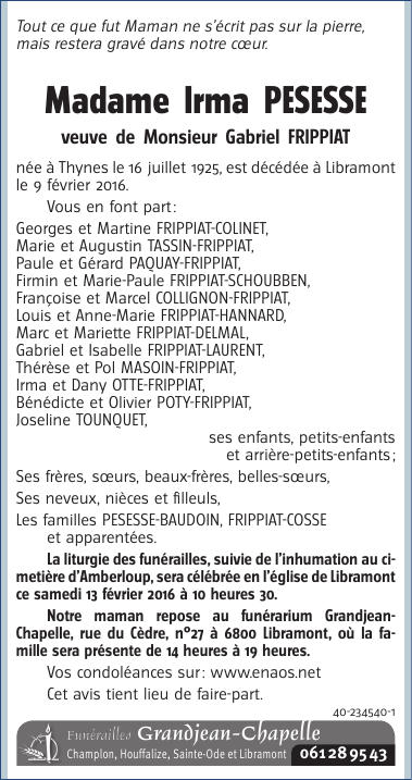 Décédée à Libramont (6800) le mardi 9 février 2016 à l'âge de 90 ans
