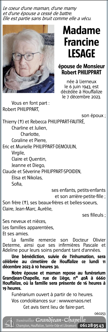 Décédée à Houffalize (6660) le jeudi 7 décembre 2023 à l'âge de 80 ans