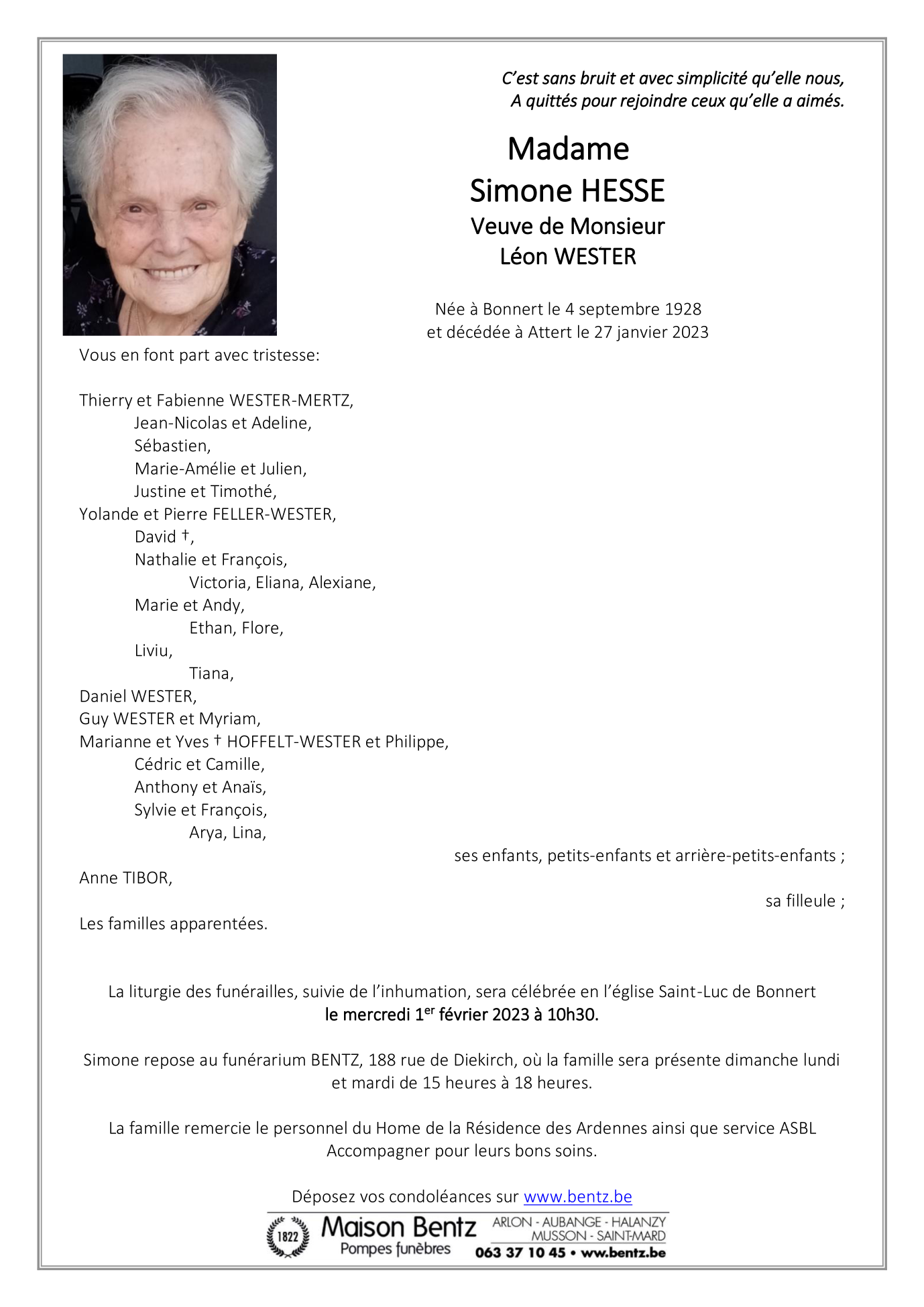 Décédée à Attert (6717) le vendredi 27 janvier 2023 à l'âge de 94 ans