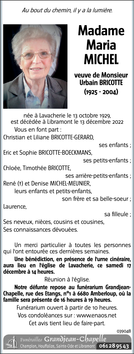 Décédée à Libramont (6800) le mardi 13 décembre 2022 à l'âge de 93 ans