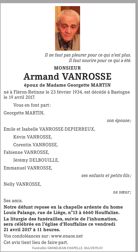 Décédé à Bastogne (6600) le mercredi 19 avril 2017 à l'âge de 83 ans