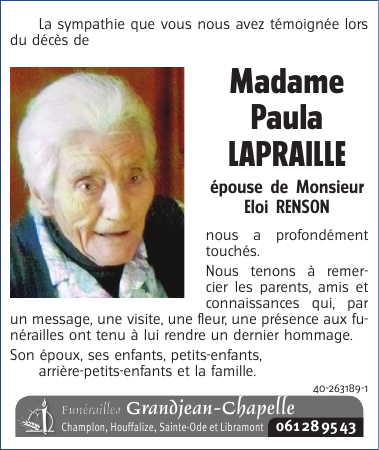 Décédée à Erneuville (6972) le vendredi 3 février 2017 à l'âge de 85 ans