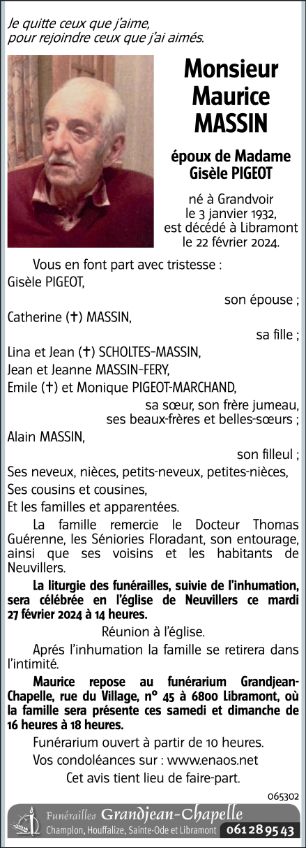 Décédé à Libramont (6800) le jeudi 22 février 2024 à l'âge de 92 ans