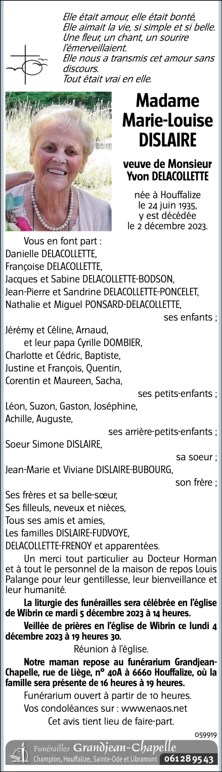 Décédée à Houffalize (6660) le samedi 2 décembre 2023 à l'âge de 88 ans