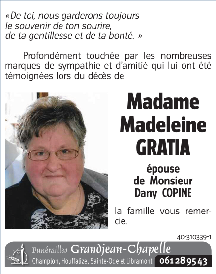 Décédée à Bastogne (6600) le vendredi 18 janvier 2019 à l'âge de 68 ans