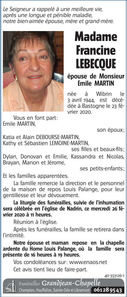 Décédée à Bastogne (6600) le dimanche 23 février 2020 à l'âge de 75 ans