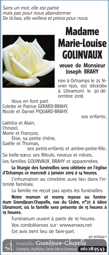 Décédée à Libramont (6800) le dimanche 30 décembre 2018 à l'âge de 98 ans