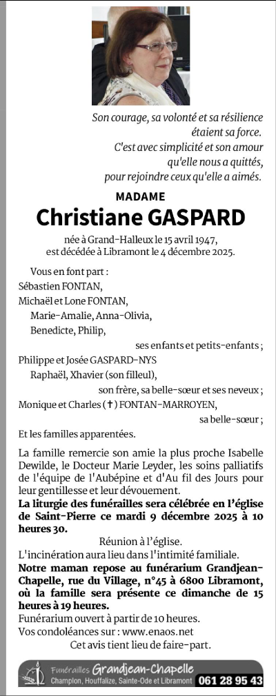 Décédée à Libramont (6800) le jeudi 4 décembre 2025 à l'âge de 78 ans
