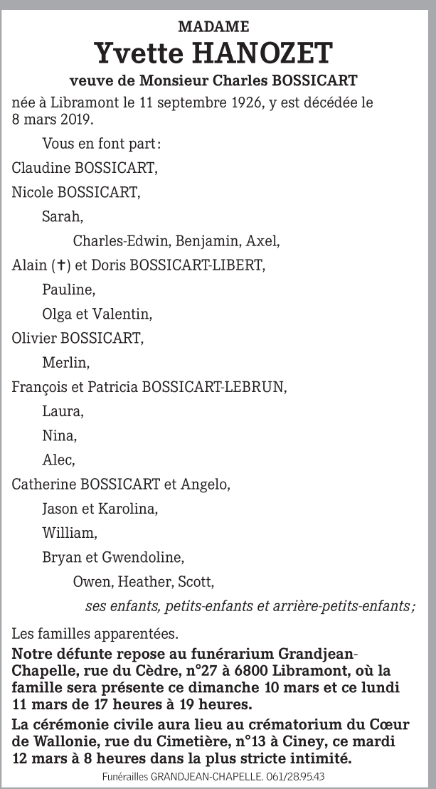 Décédée à Libramont (6800) le vendredi 8 mars 2019 à l'âge de 92 ans