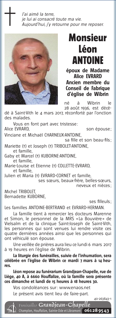 Né à Wibrin (6666) le vendredi 28 août 1936
