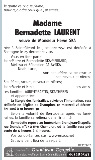 Décédée à Bastogne (6600) le dimanche 25 décembre 2016 à l'âge de 64 ans