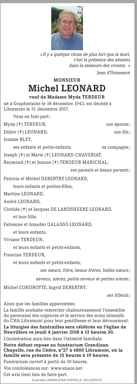 Décédé à Libramont (6800) le dimanche 31 décembre 2017 à l'âge de 74 ans