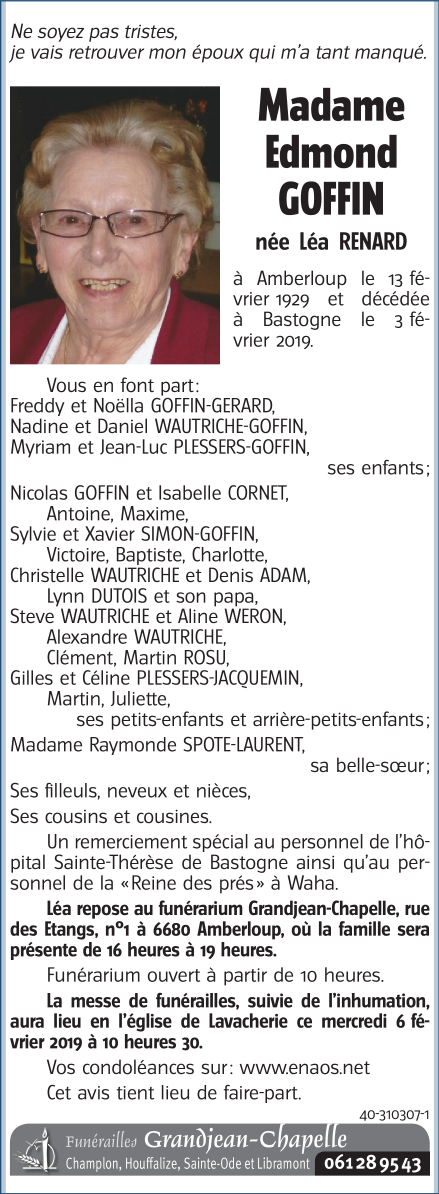 Décédée à Bastogne (6600) le dimanche 3 février 2019 à l'âge de 89 ans