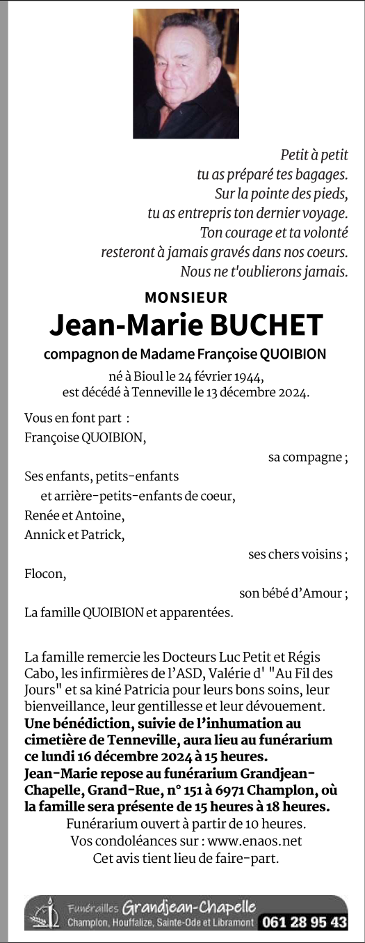 Décédé à Tenneville (6970) le vendredi 13 décembre 2024 à l'âge de 80 ans