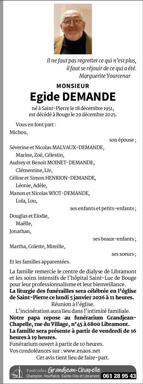 Décédé à Bouge (5004) le lundi 29 décembre 2025 à l'âge de 74 ans