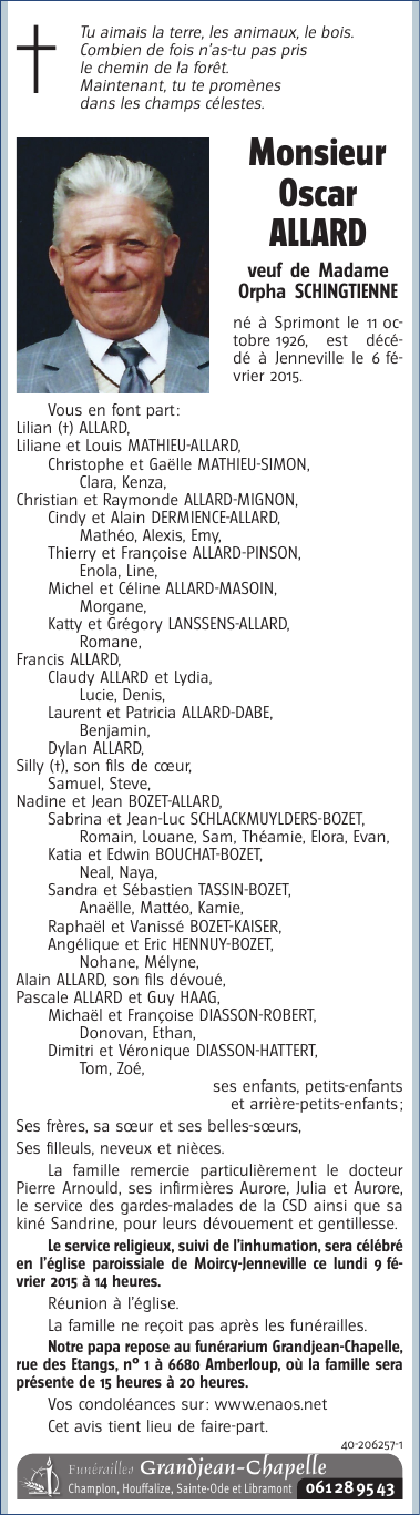 Décédé à Jenneville (6800) le vendredi 6 février 2015 à l'âge de 88 ans