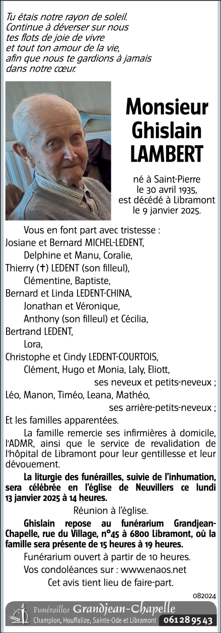 Décédé à Libramont (6800) le jeudi 9 janvier 2025 à l'âge de 89 ans