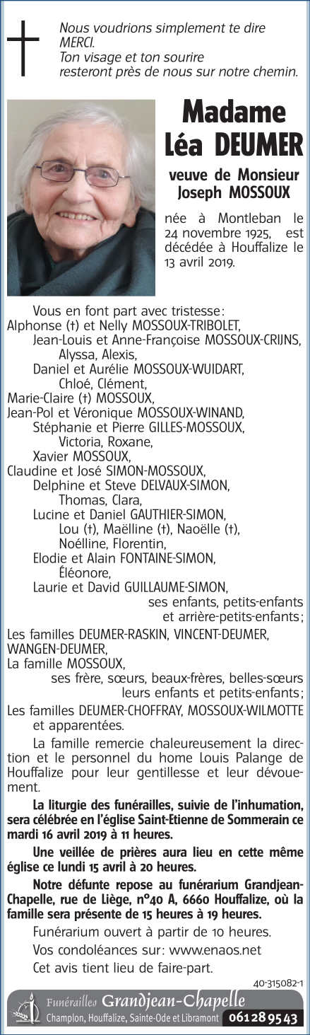 Décédée à Houffalize (6660) le samedi 13 avril 2019 à l'âge de 93 ans