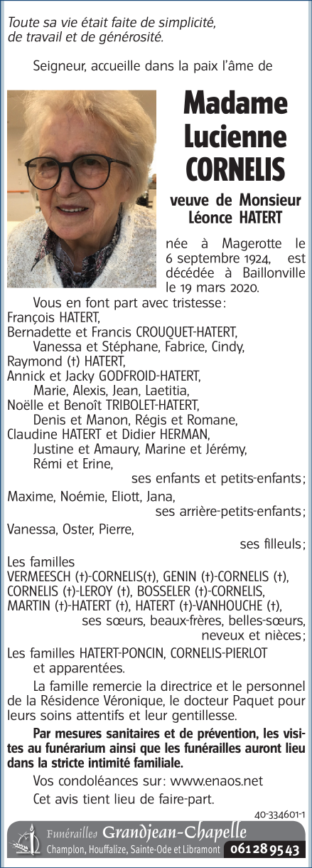Décédée à Baillonville (5377) le jeudi 19 mars 2020 à l'âge de 95 ans