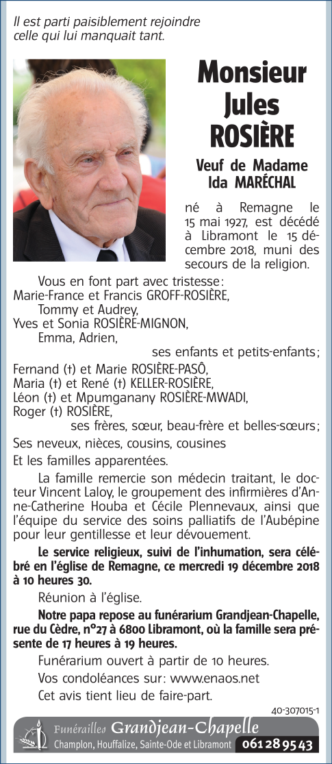 Décédé à Libramont (6800) le samedi 15 décembre 2018 à l'âge de 91 ans