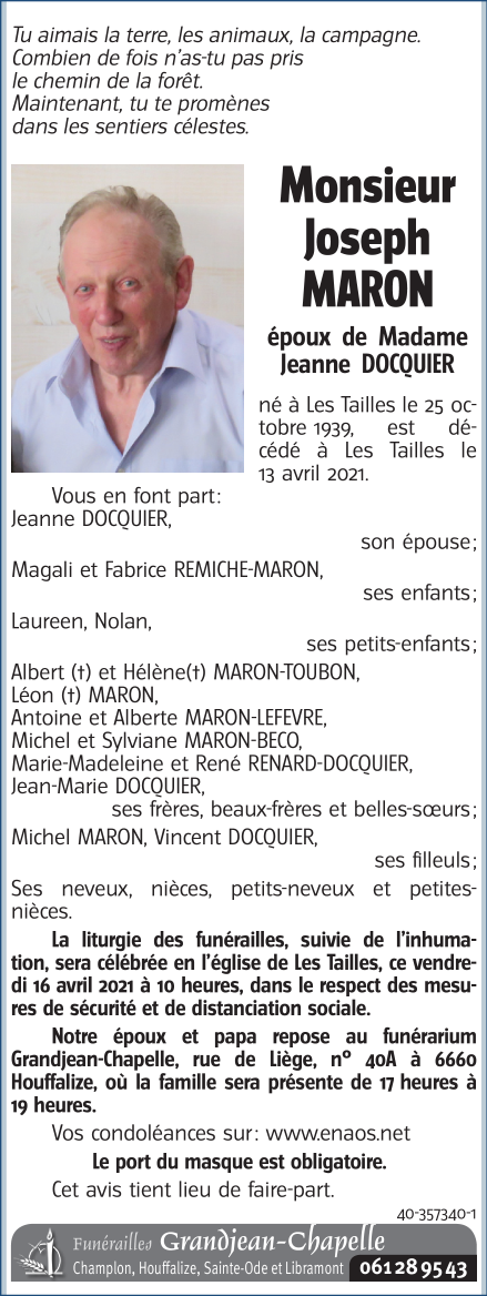 Décédé à Les Tailles (6661) le mardi 13 avril 2021 à l'âge de 81 ans