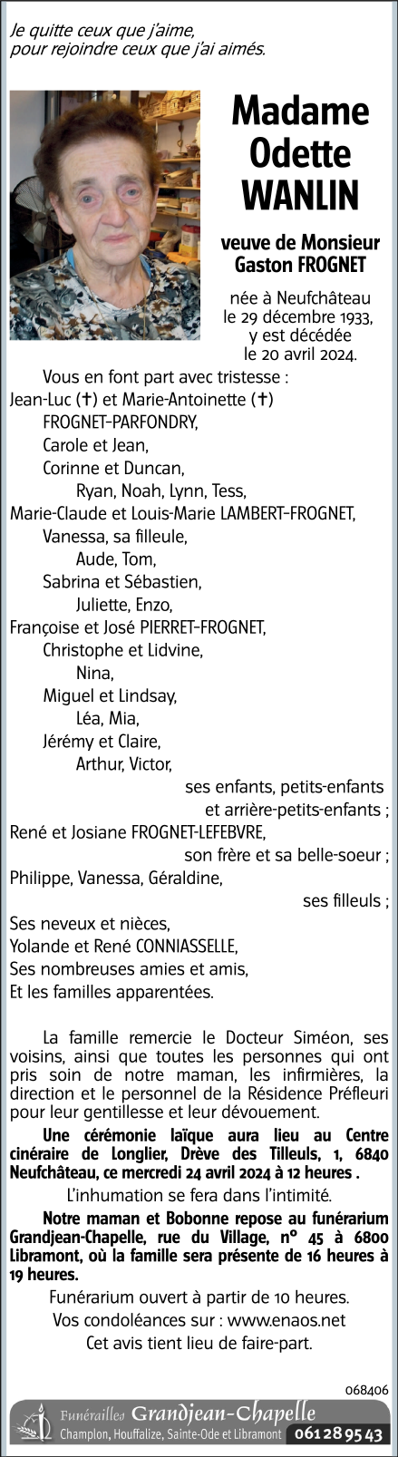 Décédée à Neufchâteau (6840) le samedi 20 avril 2024 à l'âge de 90 ans