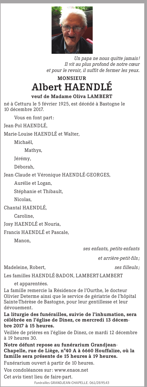 Décédé à Bastogne (6600) le dimanche 10 décembre 2017 à l'âge de 92 ans