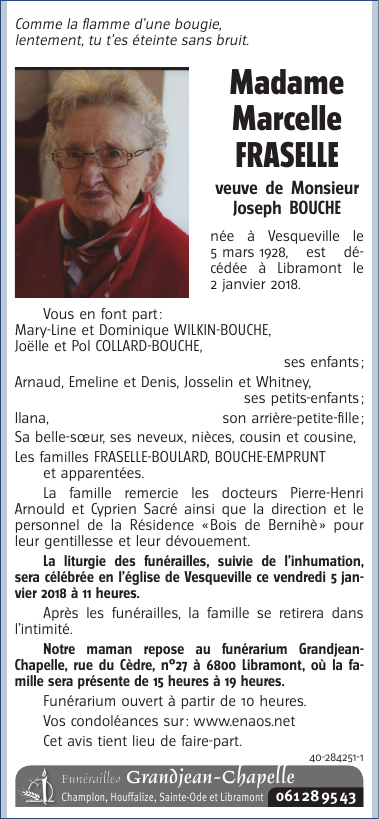 Décédée à Libramont (6800) le mardi 2 janvier 2018 à l'âge de 89 ans