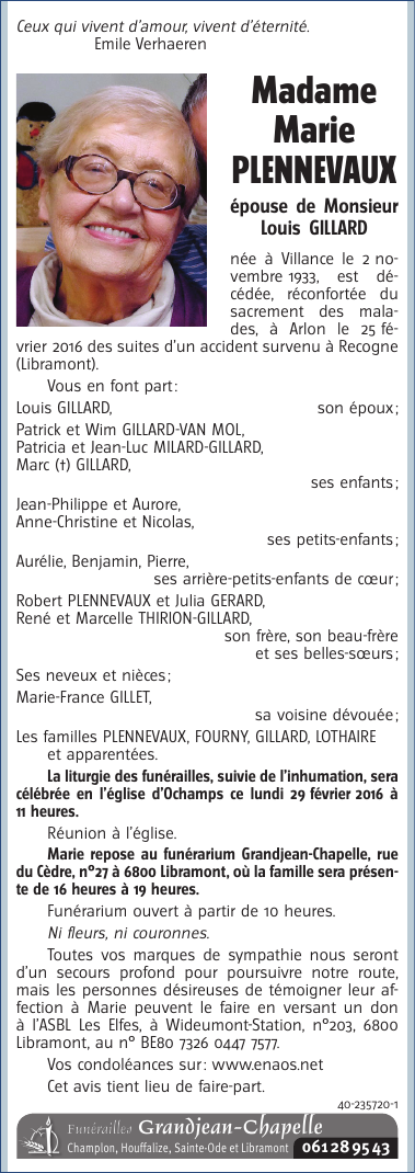 Décédée à Arlon (6700) le jeudi 25 février 2016 à l'âge de 82 ans