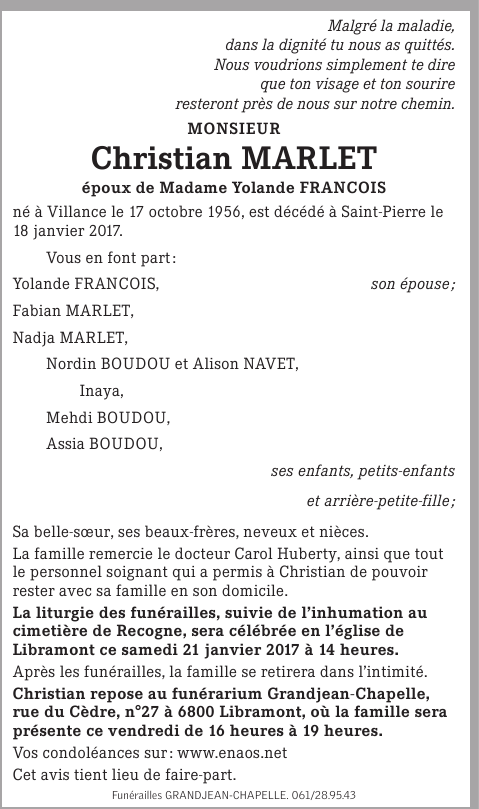 Décédé à Saint-Pierre (6800) le mercredi 18 janvier 2017 à l'âge de 60 ans