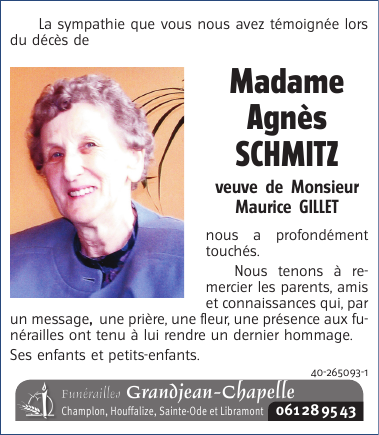 Décédée à Champlon (6971) le vendredi 10 mars 2017 à l'âge de 86 ans